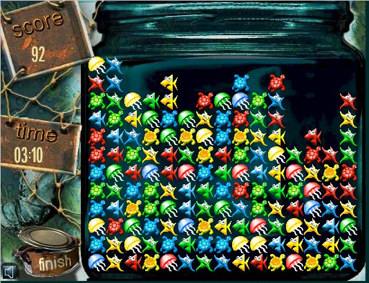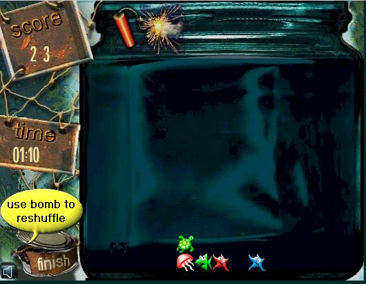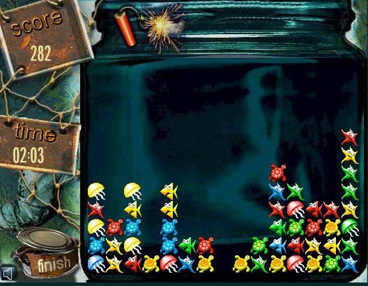 Aqua-Rush is a Collapse-like game. The object of the game is to score as many points as possible by collapsing the groups of 2 or more adjacent sea-creatures. With the left mouse button, a player can collapse a group of 2 or more sea creatures of the same color. With the right mouse button, a player can collapse a group of 2 or more sea creatures of the same shape. Try to form longer groups of sea creatures to score more points: The deletion of 2 critters gives you 1 pt, 3 critters - 3 pts, 4 critters 6 pts, 5 critters 10 pts, 6 critters 15 pts and so on. Clicking the bomb makes it possible to reshuffle the remaining groups of sea creatures, grouping them together, however, every time it's used, the points will get subtracted as penalty. You can play online internet game Aqua-Rush and win money prizes.