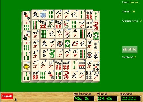 There are a total of 72 pairs in a game of MahJong Solitaire. The tiles have standard suits. These suits are Characters, Bamboos, Circles, Dragons, Winds, Seasons. When matching pairs, Seasons and Flowers are the only suits you do not need to match exactly. Reshuffle button can be used when no moves are available. A maximum of 5 reshuffles per game is allowed.