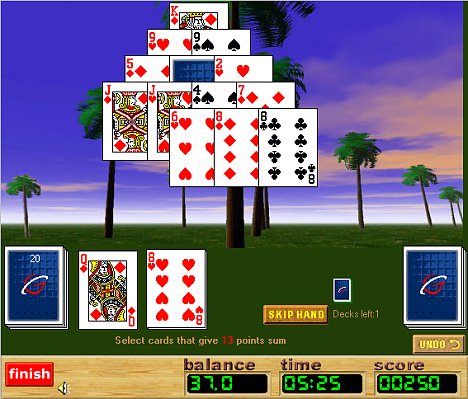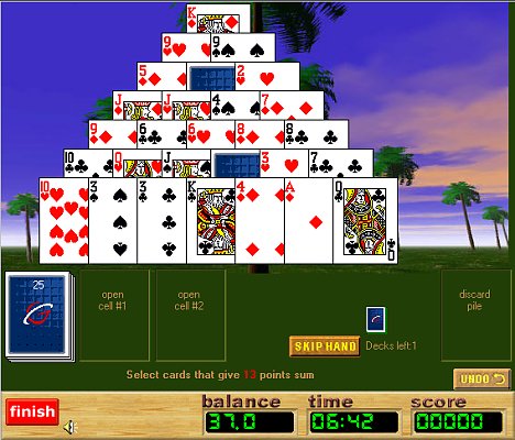 If you experience difficulties completing the current pyramid, you can use 'skip hand' button to continue with the next one (regular Pyramid-13 tournaments are 2-deck games).